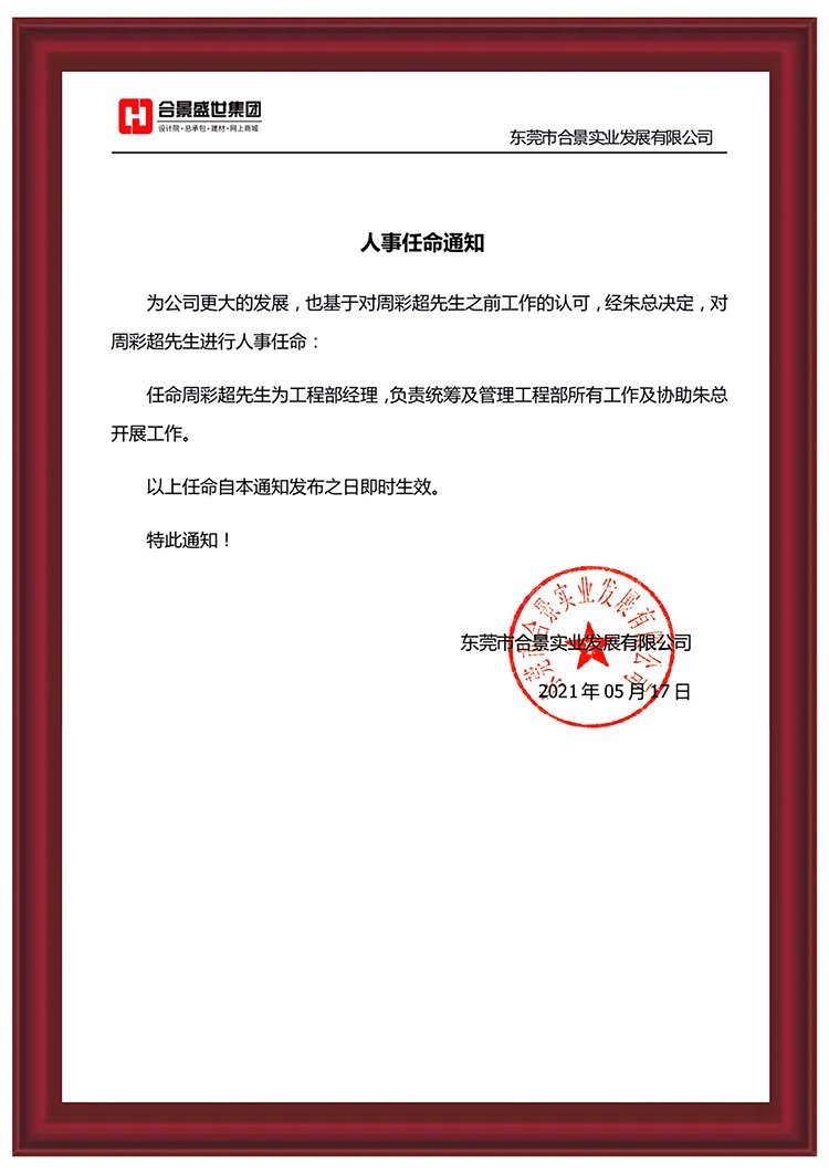 任命周彩超先生為工程部經(jīng)理,負(fù)責(zé)統(tǒng)籌及管理工程部所有工作及協(xié)助總經(jīng)理開(kāi)展其他工作。