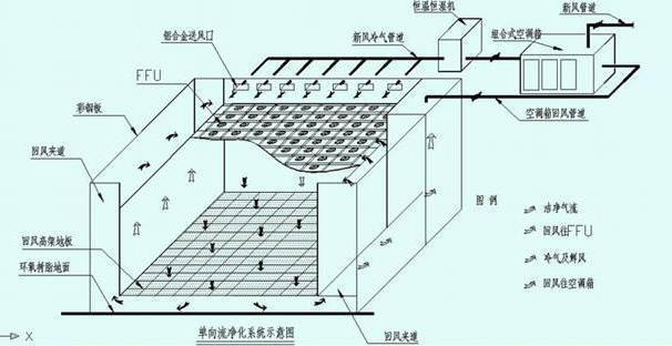 氣流→初效凈化→加濕段→加熱段→表冷段→中效凈化→風(fēng)機送風(fēng)→管道→高效凈化風(fēng)口→吹入房間→帶走塵埃細(xì)菌等顆粒 → 回風(fēng)百葉窗→初效凈化 重復(fù)以上過程,即可達(dá)到凈化目的。
